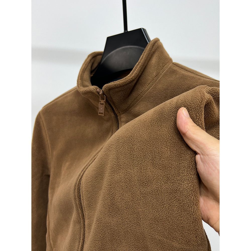 Men's Stand Collar Zipper Cardigan Thick Warm Polar Fleece Solid Color Jacket